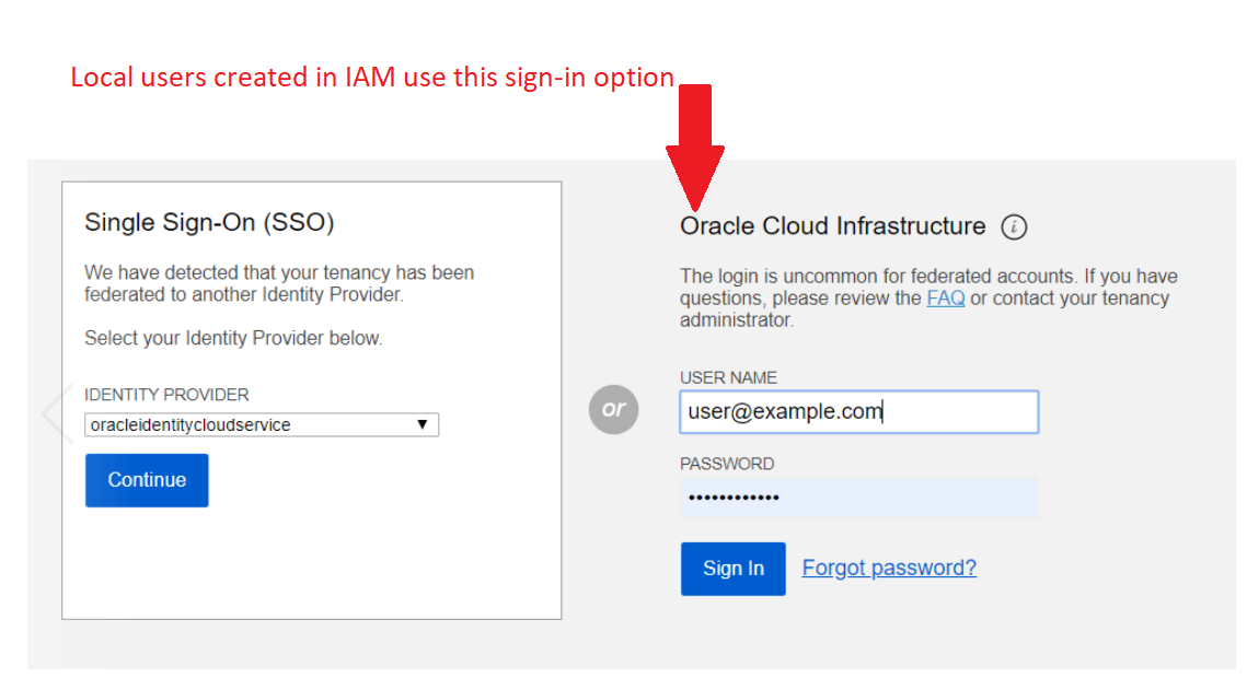 Users created through this procedure are created in IAM and are sometimes called "local users." If your tenancy is federated with another identity provider (such as Oracle Identity Cloud Service, Azure AD, or Okta), your sign-in page to the Console displays two options for signing in. The local users you create in IAM use the Oracle Cloud Infrastructure option to sign in, as shown in the following image: