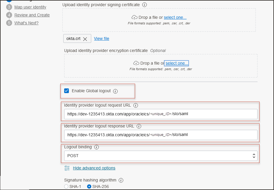 • For Upload identity provider signing certificate: Use the .pem file of the Okta certification.