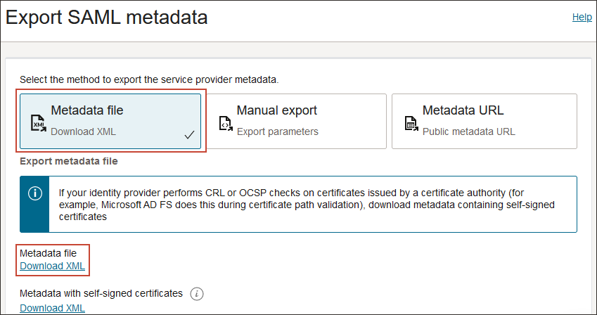 • Get the OCI IdP metadata and the signing certificate for the identity domain.