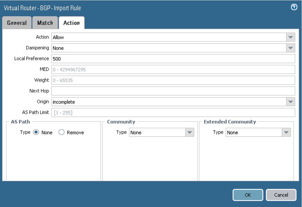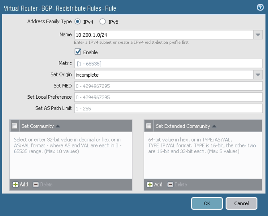 On the Redist Rules tab, configure the parameters as shown in the next screenshot. Here you announce the on-premises network CIDR in BGP.