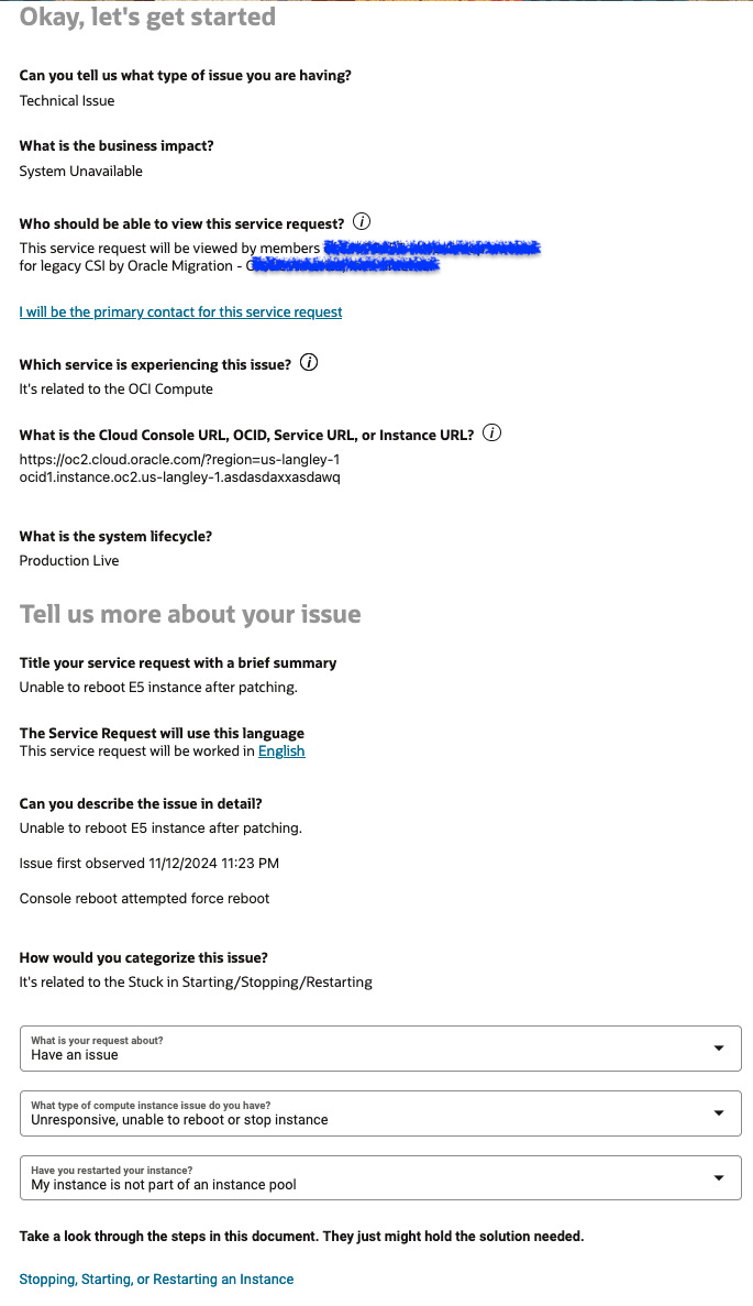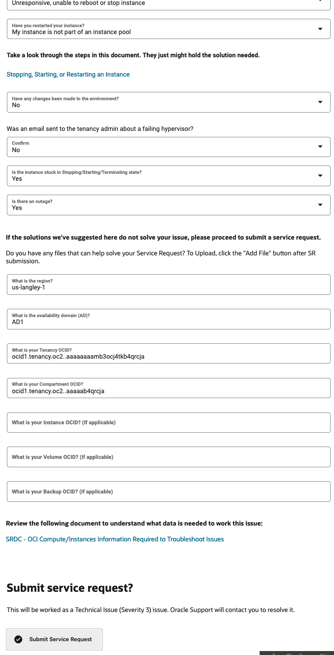 Creating a service request is a multi-step process. When you provide as much detail as possible, it helps the engineers who work on the request to troubleshoot faster. However, you need to ensure that you don't enter any sensitive information as defined by any compliance standards you're required to maintain.