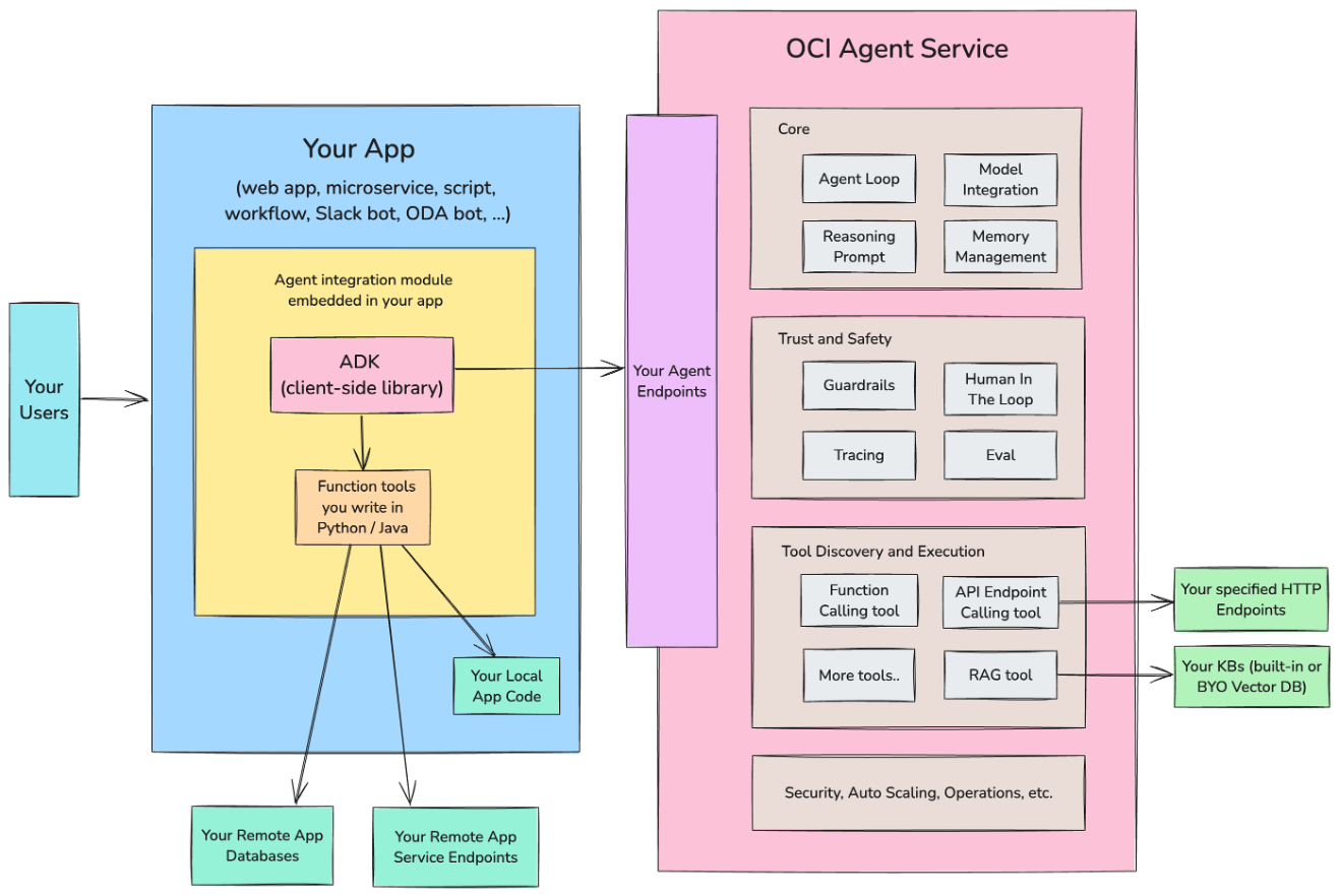 The ADK calls the agent endpoint, exposed by OCI Generative AI Agents service, which runs the agent loop remotely to your environment.