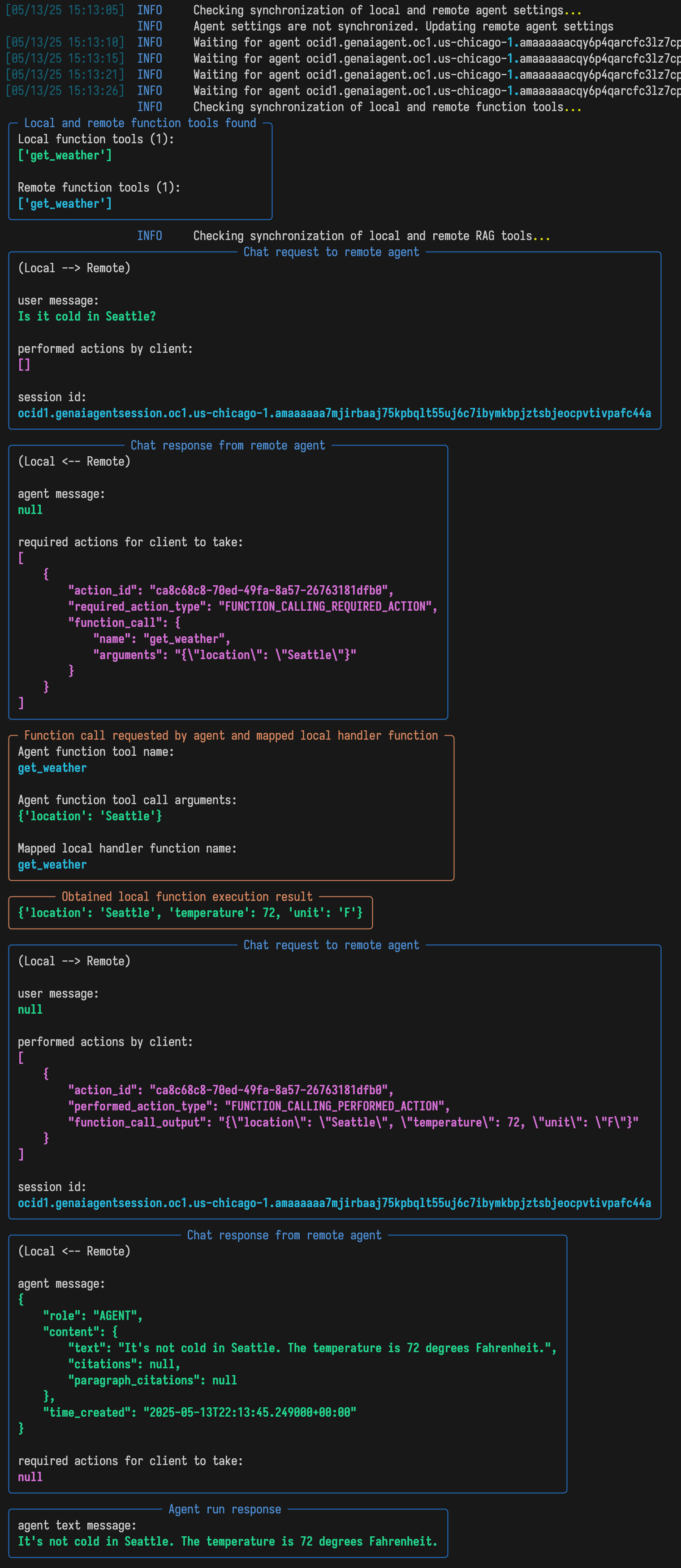 Now you have a simple weather agent using ADK running locally, with outbound connection to your agent endpoint on OCI.